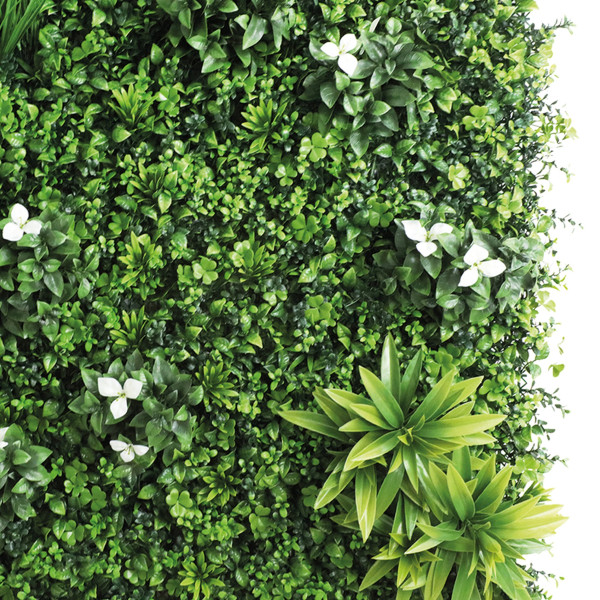 Siepe decorativa da parete con foglie in pe fissate con sistema “point” ad incastro.