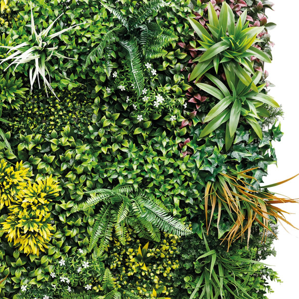 Siepe decorativa da parete con foglie in pe fissate con sistema “point” ad incastro.